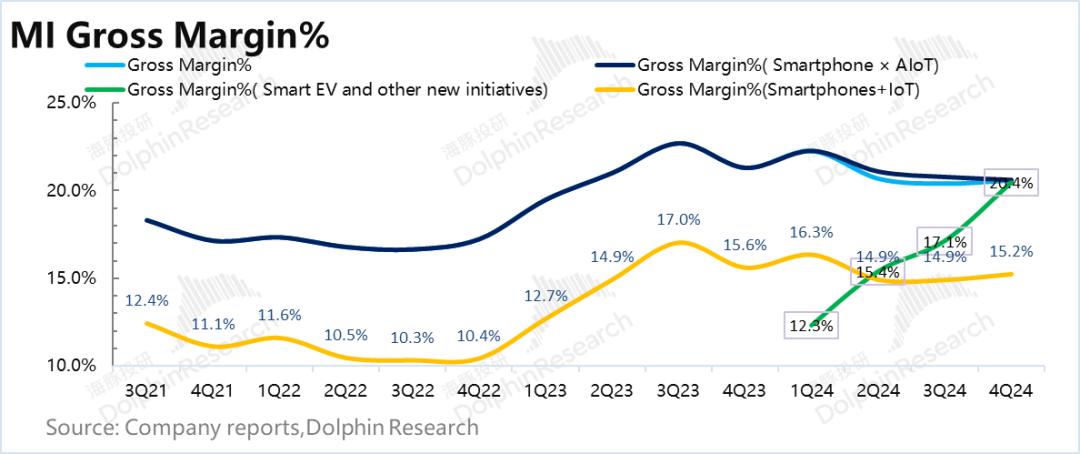 第四季度汽车实际毛利率为20.4%,符合海豚君的预期。在这种情况下,小米的汽车毛利率已经完全超过了物联网。 移动电话两个硬件的综合毛利-15%。