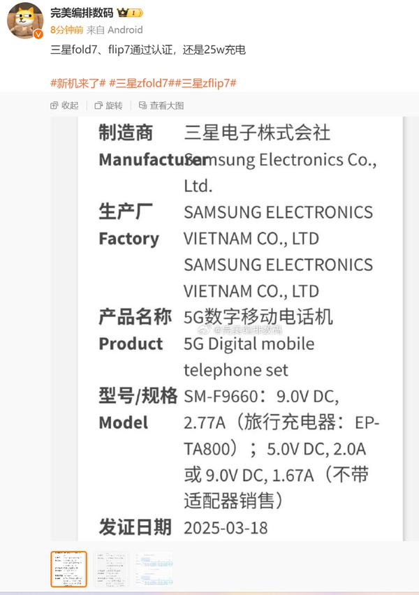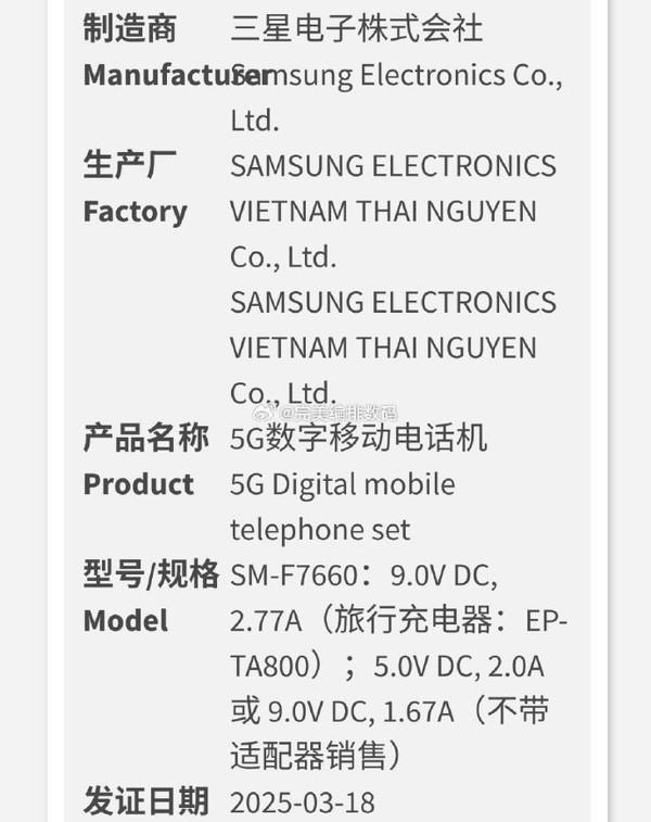 【CNMO 科技消息】3 月 19 日,三星 Z Fold7 大折叠屏和 Z Flip7 小型折叠屏已经通过 3C 认证,两款车型都支持认证。 25W 充电。根据之前的消息,这两款新机将于今年进行。 7 月份正式发布。