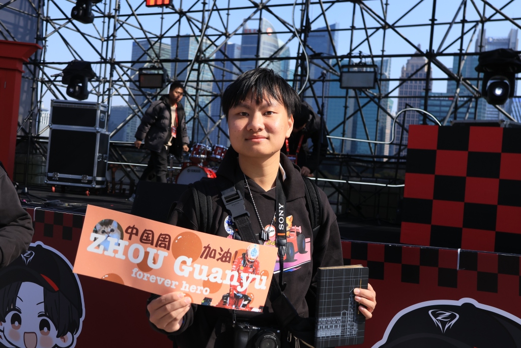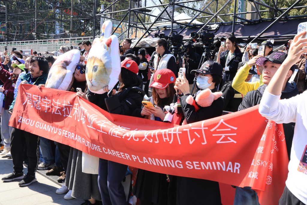 他们有的举着“周冠宇法拉利职业规划研讨会”的巨大横幅,有的穿着法拉利成员的“大头贴”衬衫,有的举着周冠宇宠物猫“玉米”的娃娃...通过一系列新颖的操作,骑手们展示了他们的热情,这也让周冠宇意识到了他们。