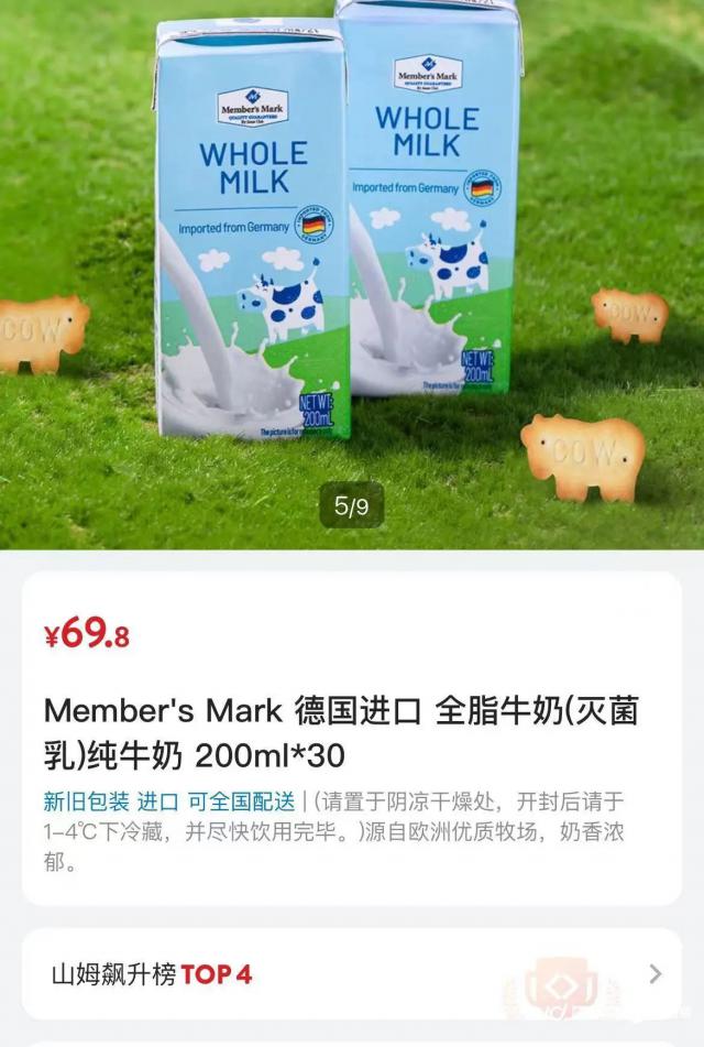 山姆 APP 显示,此次涉及的商品是山姆自有品牌的全脂牛奶,声称是从德国进口的。“山姆飙升榜第四”。在山姆 APP 上,30 瓶 200mL 的产品售价 69.8 人民币,每瓶牛奶均价。 2.33 人民币。根据产品信息,山姆(上海)投资有限公司是同一产品的经销商,制造商是 Arla Foods Deutschland GmbH,Niederlassung Pronsfeld,德国是原产国。