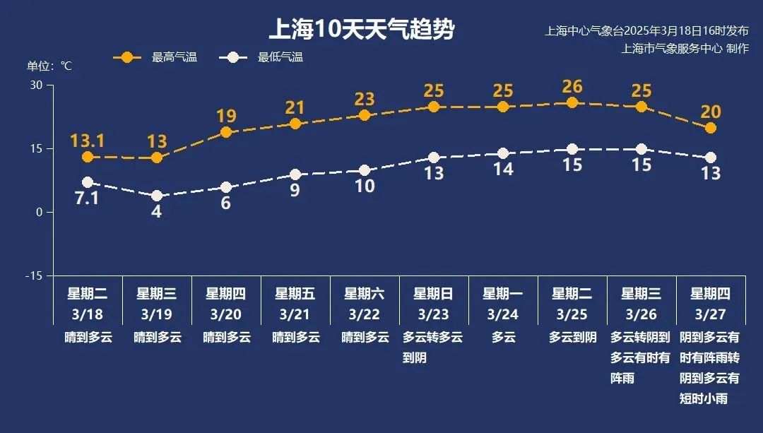 周四气温“起飞”。从周五开始,最高气温来到“2”前缀,一天比一天暖和。这个星期天下周初的下午,甚至会有初夏的体验。最低气温也是“节节高”,但昼夜温差还是比较大的,几乎都超过了10℃。早春天气不稳定,容易诱发感冒等疾病。每个人都应该小心穿衣服。