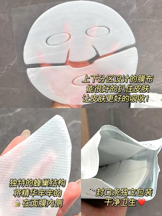 膜布采用蜂窝锁吸设计,可以把精华营养全部锁在蜂窝里,敷在脸上也会更贴服,渗透性好,吸收性好!
