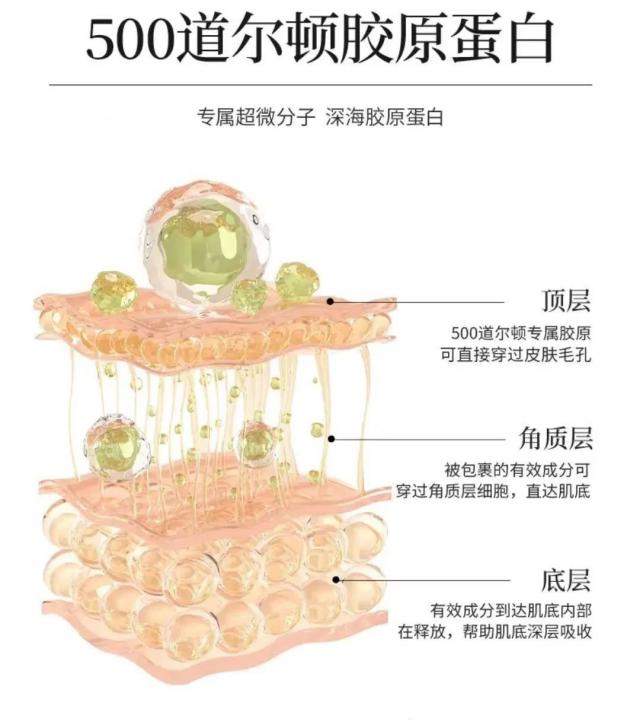 这种小分子胶原蛋白可以通过毛孔直接到达肌底,精确吸收皮肤点对点,调节细胞活性,加速胶原蛋白。 z 生长,使皮肤饱满紧致,每天都是砰的一声滋润。