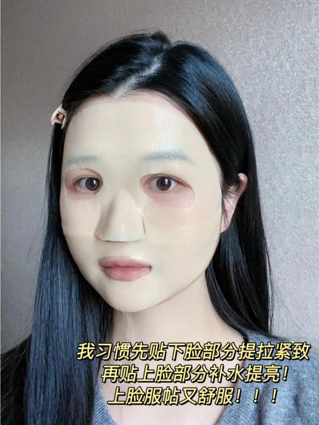 然后将面膜的凹凸面贴合皮肤。眼睛位置的圆形面膜可以敷在玉玺纹上。 40 分钟~1 小时候,面膜会变得透明,时间可根据自己的情况进行调整。