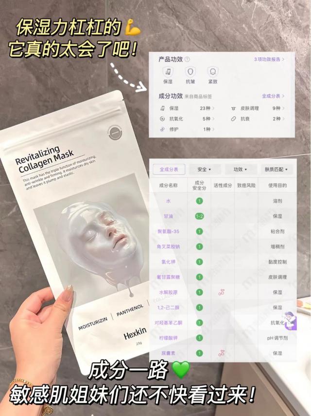 赫诗琴这一系列面膜,全部选用500 道尔顿专属小分子胶原蛋白,涂抹后,直接通过肌底,直接在脸上补充胶原蛋白,k 皱 j 致,水润砰的一声,感觉就像是做了一次电影级别的全脸。 Spa 。