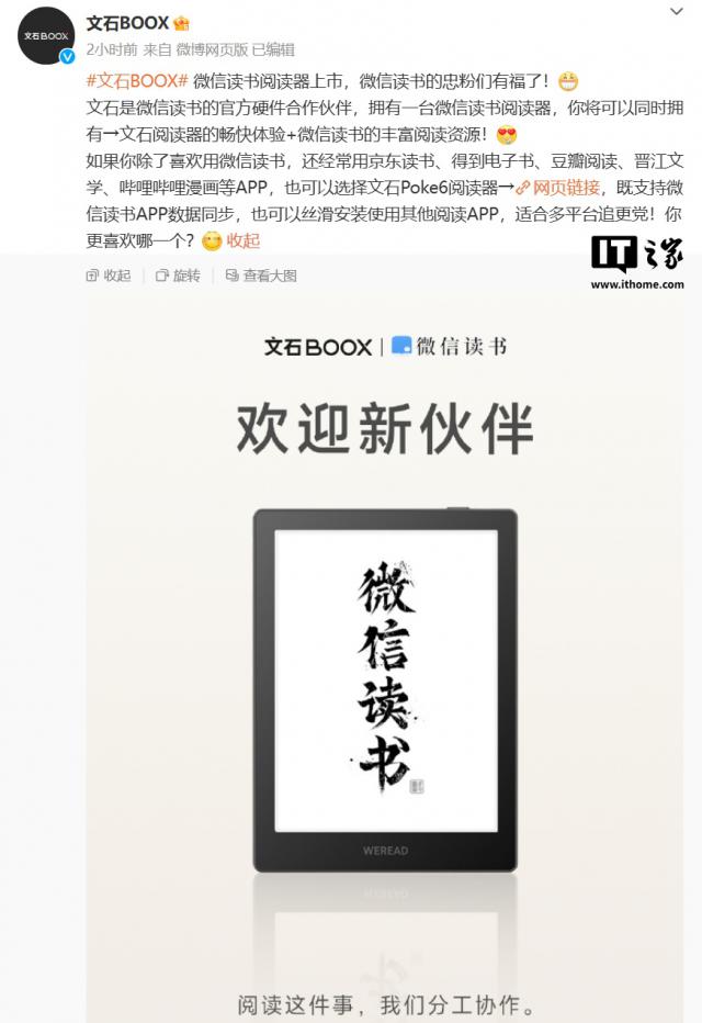 微信阅读器上市,文石为“官方硬件合作伙伴”