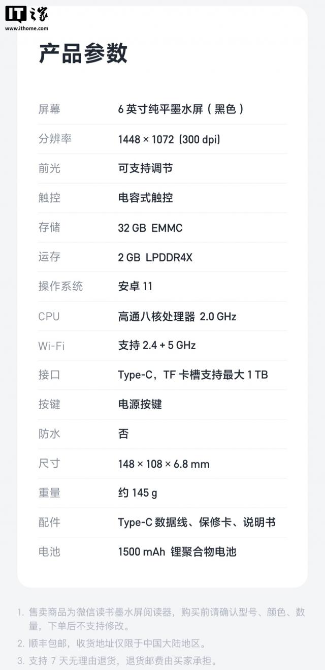 据 IT 据世家报道,新款微信阅读墨水屏阅读器的宽度为 148×108×6.8mm,搭载高通 8 核(2.0 GHz)Cpu,配置 6 英尺 Carta1300 屏幕(分辨率) 1448×1072、300 dpi),提供 32GB EMMC 存储 2GB LPDDR4X 存储。产品参数如下: