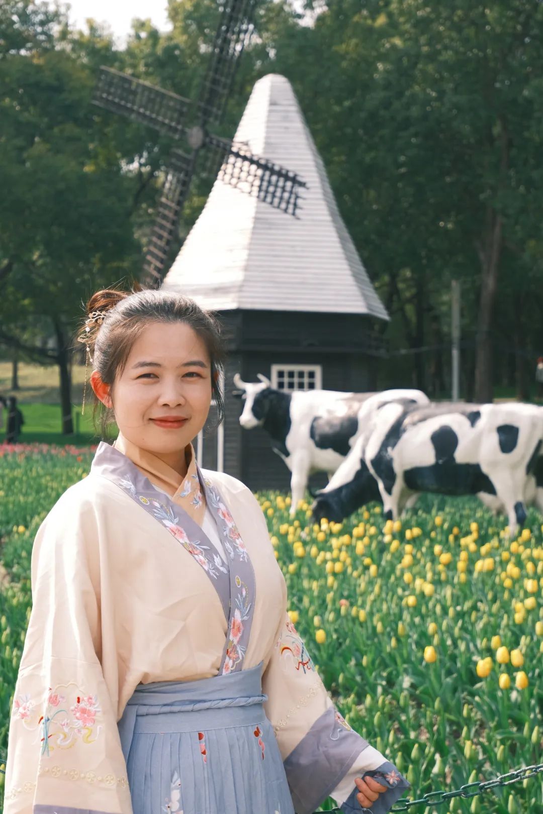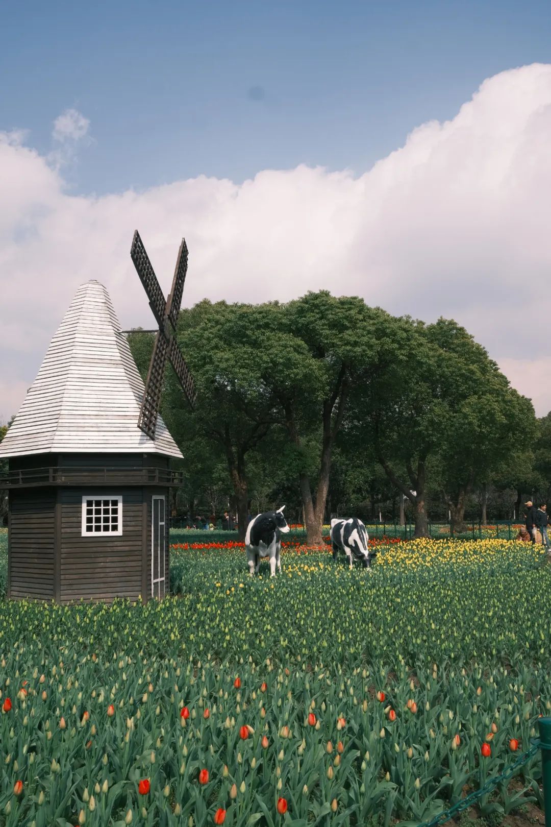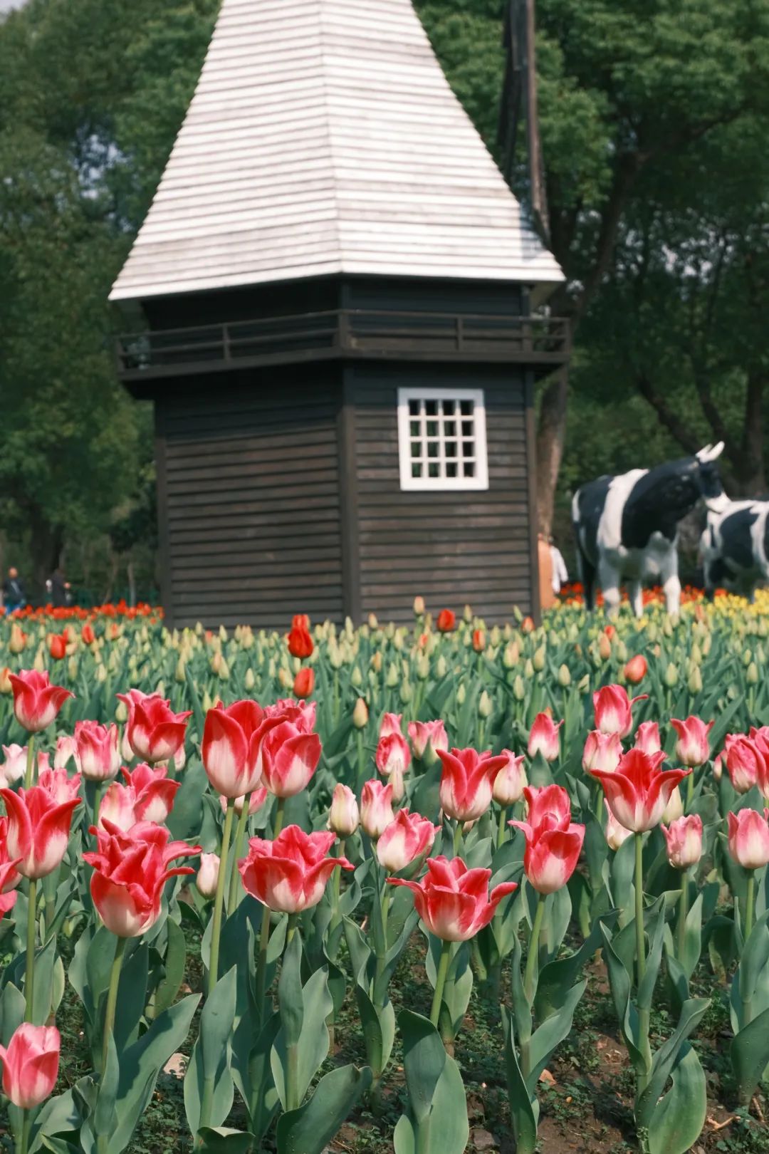 从大宁公园西门进入,步行5-10分钟即可到达花田。这是一片农场主题的花海,由红、白、黄三色郁金香交织而成。木屋、风车、“牛”共同勾勒出一幅宁静美丽的田园风光图,游客仿佛一秒钟就“穿越”到了荷兰镇。