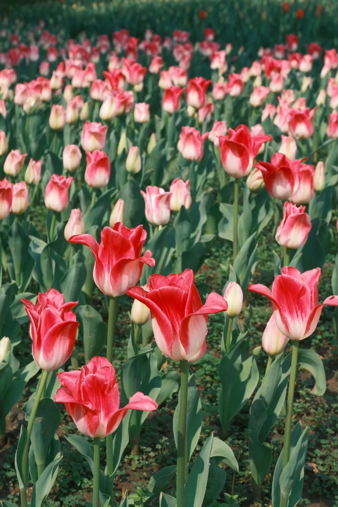 在公园里,不同颜色的郁金香田铺满了视线,粉色清新,红色温暖,黄色优雅,白色纯净...重叠,色彩斑斓,色彩斑斓,和谐。在花丛中,游客如织,或停下来欣赏,或拍照留念,或与花共舞。