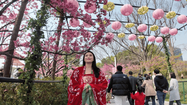 “听说大宁公园最近正在举办花朝节,还有一些民族主题活动,比如非物质文化遗产市场、礼服展示等。我只想穿汉服过来玩。就在最近,郁金香也盛开了,非常适合带孩子去参观。公园风景很好。”在罗马广场前的郁金香花田里,古代女性穿着汉服,和儿子和丈夫一起来花园赏花。