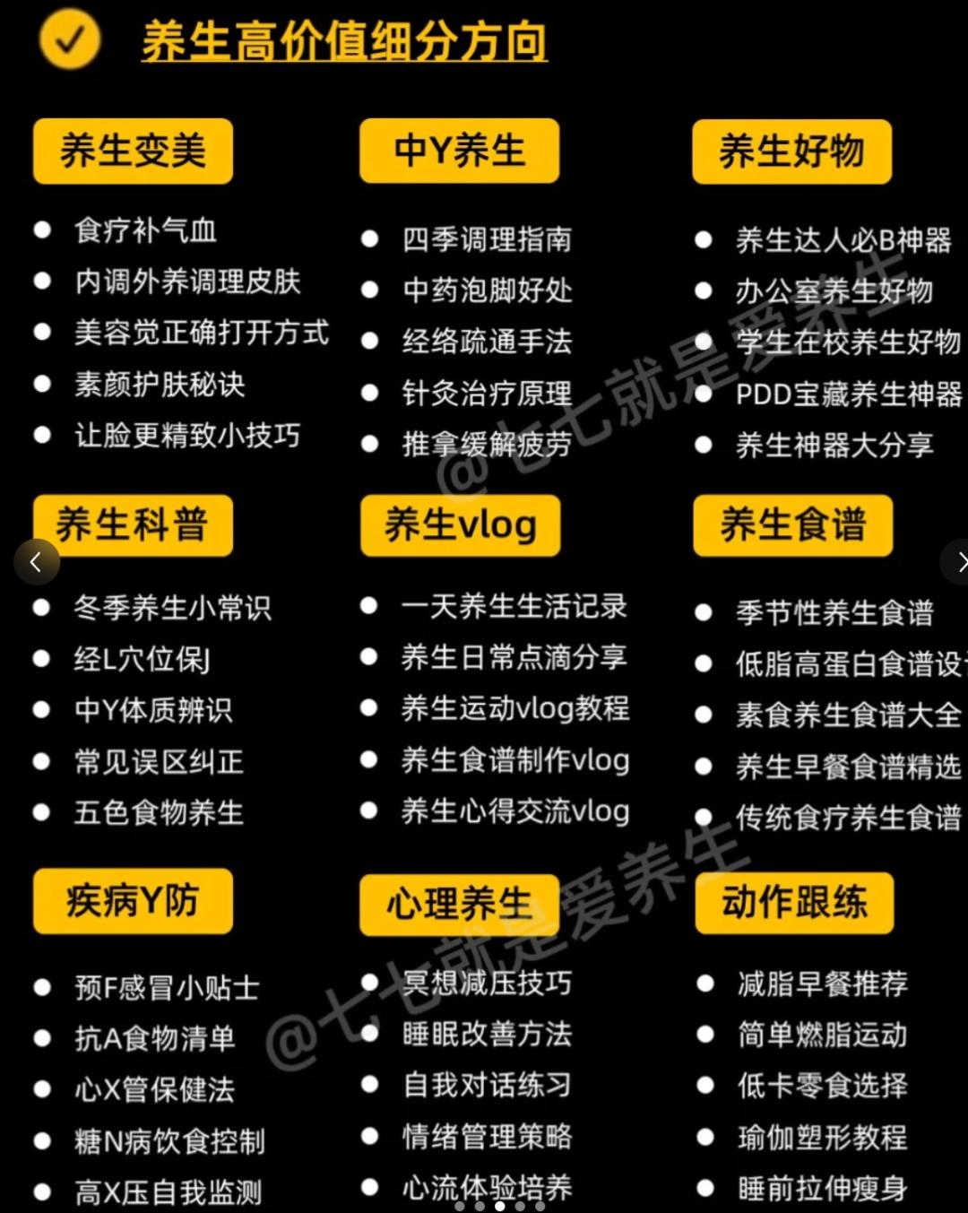 在小红书,健身养生的话题笔记已经超过1万篇,大量健身KOL已经完成了从健身到健身的跨界赛道。甚至疫情过后,大量直接依靠健身的直接出现。「养生内容」达到流动性的博主。甚至达到了更精细的划分。从养生好货,到食谱食疗,知识科普,动作跟练等等。