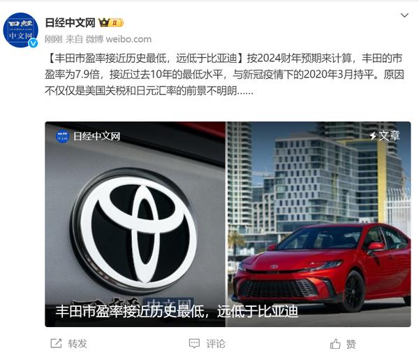 丰田汽车的市盈率只有7.9倍 接近历史低点 远不如特斯拉