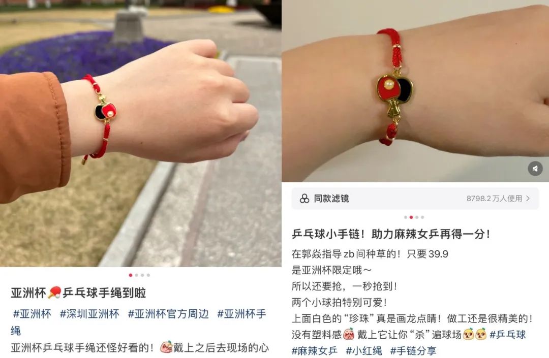 配戴这款乒乓球手绳已成为球迷们在球迷中心照不宣的应援方式。——不管是线下还是网络,都能看到很多人在比赛现场戴着手绳,球员给油标语或者宣传大屏幕。「打卡」。