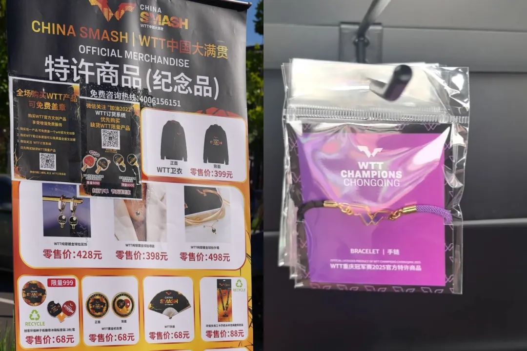 事实上,去年10月,WTT中国全满贯推出了含有乒乓球元素的耳环、项链和手镯,价格在400元左右,比线下还早。现在亚洲杯乒乓球手绳「爆红」这一逻辑的可行性得到了进一步的验证,所以刚刚结束的WTT重庆冠军赛衍生品阵型也有手环。