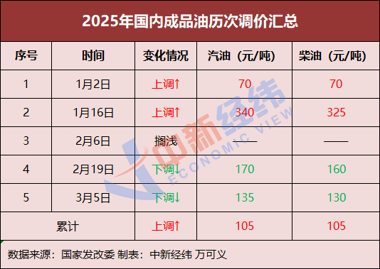 中新经纬注意到,今年以来,国内油价经历了五轮价格调整窗口,即“两涨两跌一搁浅”。价格调整后,国内汽车和柴油的价格每吨比去年年底上涨了105元。如果这一轮调整落地,2025年的价格调整将成为“两涨三跌一搁浅”。