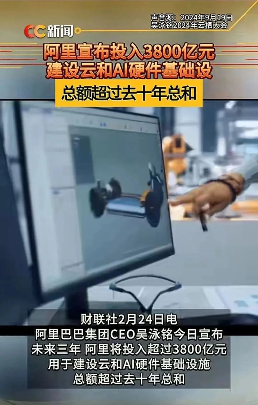 四天后,吴泳铭宣布了另一个重要消息:未来三年,阿里将投资超过3800亿元建设云和AI硬件基础设施,总额超过过去十年的总和。