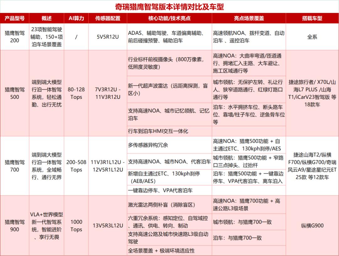 事实上,奇瑞最终选择了和比亚迪、吉利一样的想法,推出了猎鹰智能驾驶系统,拥有200/500/700/ 900四个版本,这个系统将在2025年搭载所有奇瑞车型,估计有30多个车型,包括入门级6万元的小蚂蚁。还有一个猎鹰智能驾驶Off。-Road,是越野智驾的专属技术。