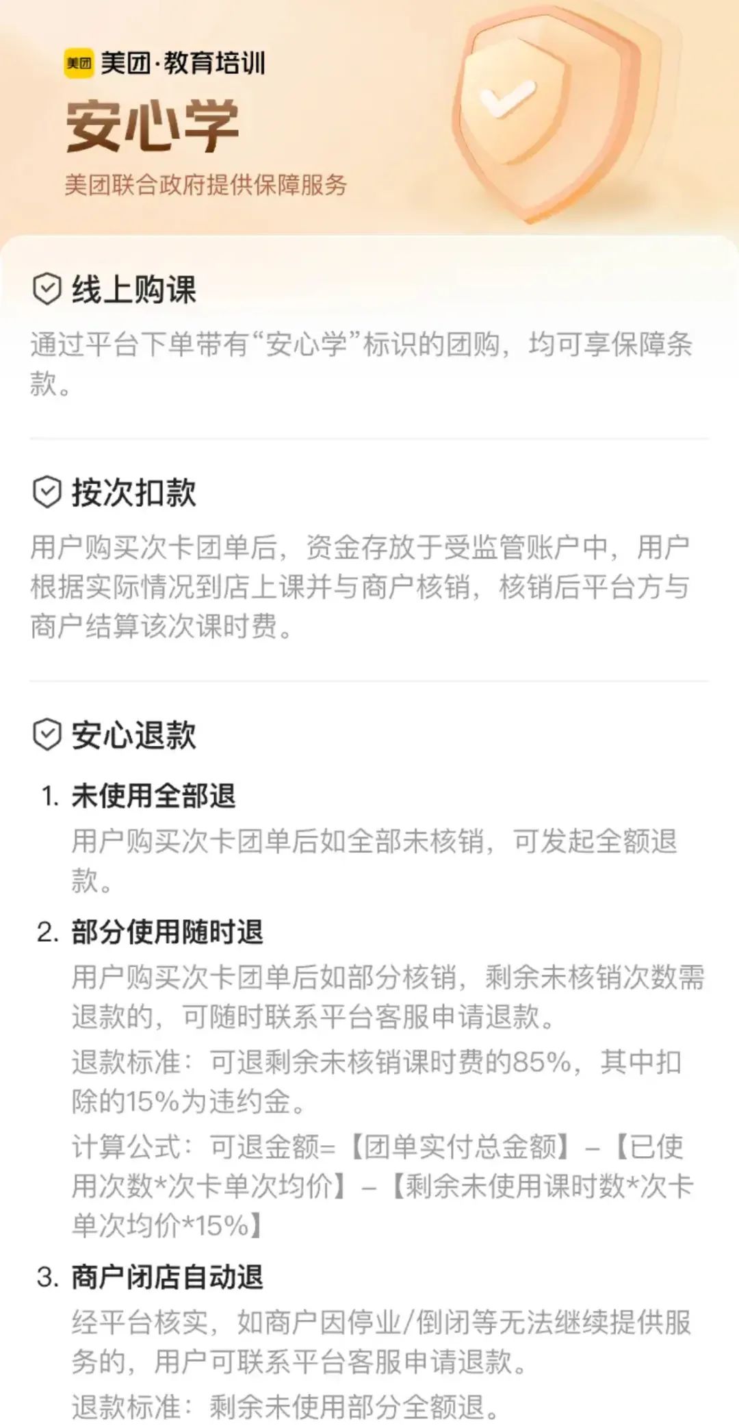 去年,美团推出了“安心学”次卡团购产品,“最后一节课,核销一次付款”。截至今年3月,全国已有数万家教育培训参与;一次消费的风从教育培训和健身一路吹入隔壁足疗按摩领域。全国近5万家商家推出次卡团购,半年内交易规模环比增长350%[6]。