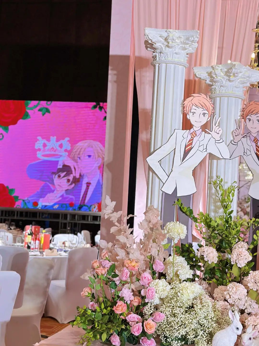 婚礼现场再现了《樱兰大学男性公关部》动画中的粉色城堡。迎宾处有手绘人物卡片,如须王环。请贴上画有须王环和藤冈春绯的动画形象。《樱兰大学男性公关部》的场景被用作暖场视频的开头和结尾的过渡。这不是婚礼主题的展览场景,而是香奈斯蒂娜为自己策划的“痛苦婚礼”。