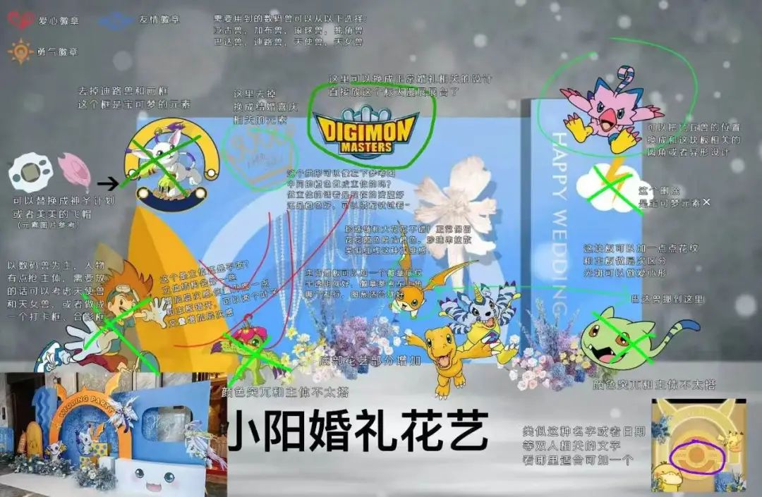 杀青形容自己是一位“令人头痛的甲方”,在修改婚礼计划的过程中。很多外人会把数码宝贝和宝可梦混为一谈。宝可梦元素出现在策划者的前两个版本中。平面效果图上写满了修改建议,从色调、纹理到每个元素的大小,没有放过任何细节。在某个版本的效果图中,她还记得自己密密麻麻地写了几十条修改建议,一时间甚至有些不好意思发给自己的策划人。