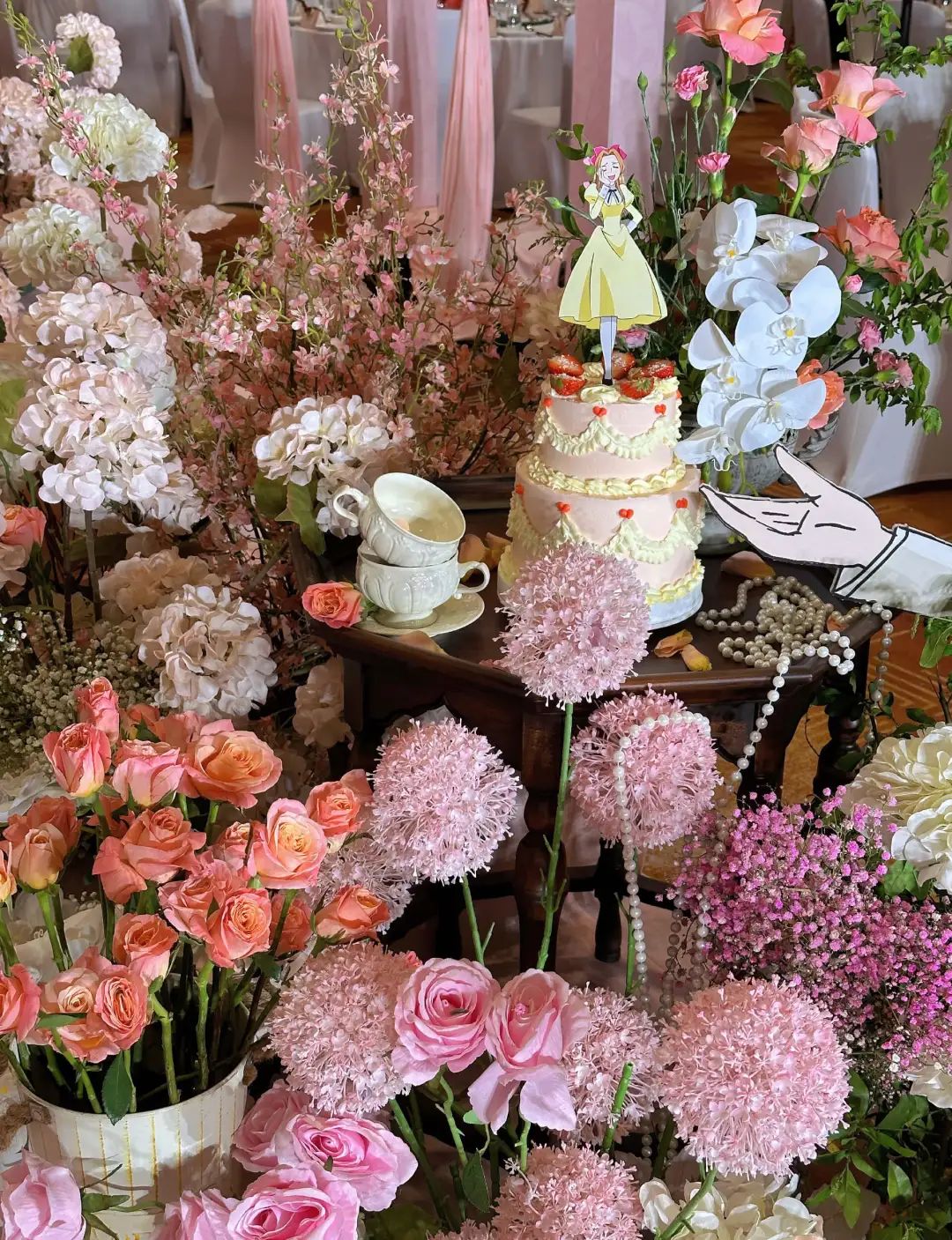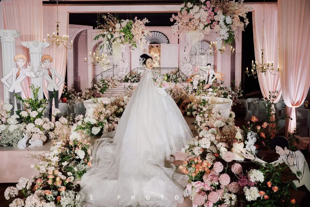 《樱兰大学男公关部》中的角色在婚礼现场随处可见,粉色城堡恢复度很高,和动画中的女主角春绯结婚时手捧花一样。经过一年半的准备,Christina终于迎来了她梦寐以求的婚礼。