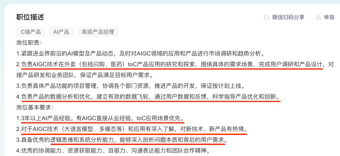 很多人会被 3 年以上 AI 商品经验被拦下,甚至可以说,现在大模型出来才一年多,哪来的? 3 年经验?