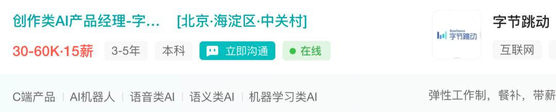 首先是字节 AI 产品岗位,薪酬范围如下 30-60k,15 薪。要求 3-5 年度工作经验,大学本科学历,base 北京。