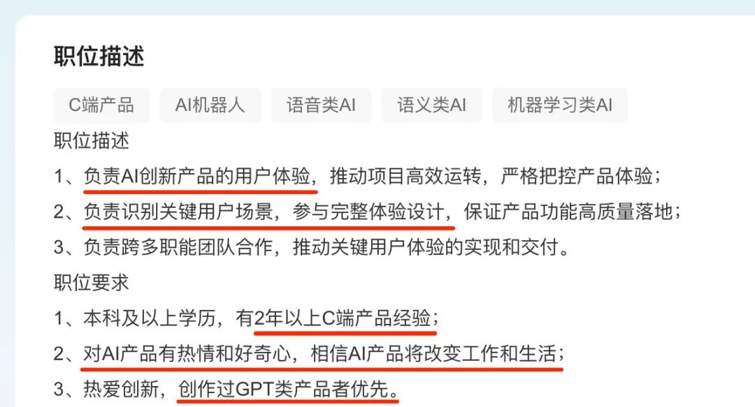 包括具体要求在内, AI 创新型产品体验设计,2 年度以上C端产品经验,创作 GPT 类产品、对 AI 热情和好奇心。