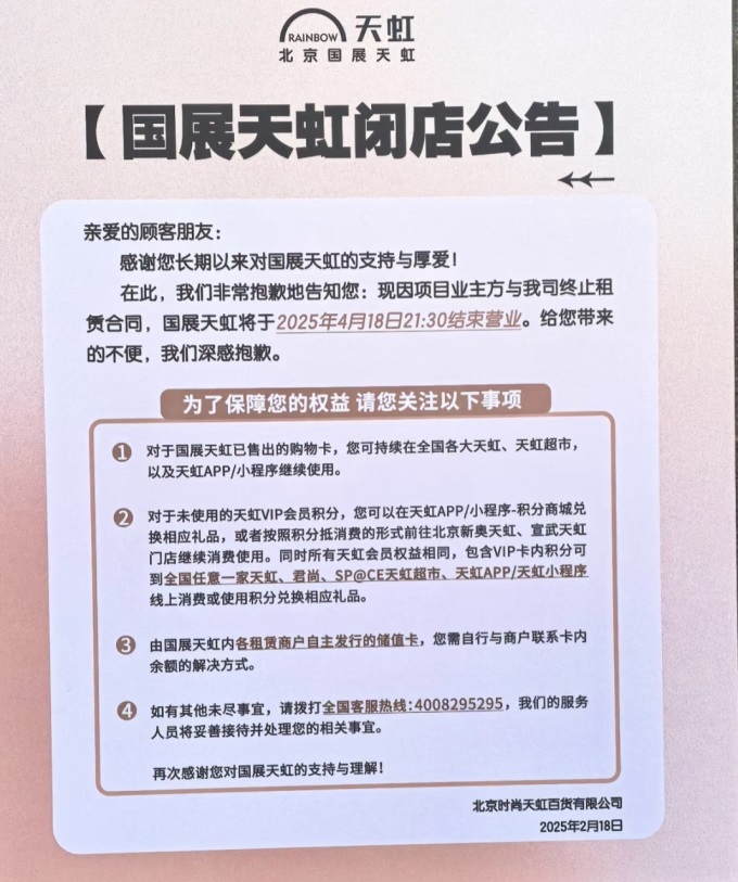 据北京日报报道,北京国展天虹将于4月18日21日举行:营业结束后30分关闭。国展天虹在公告中表示,关闭店铺是因为项目所有者停止了租赁合同。