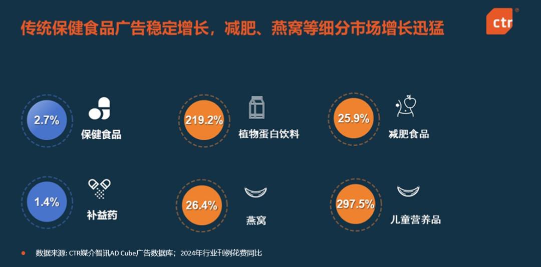 CTR媒体智讯AD 根据Cube数据,2024年与体重管理相关的减肥食品广告营销得到加强。25.9%,其中有无糖麦片、代餐奶昔、即食鸡胸肉、低热量零食等畅销产品。