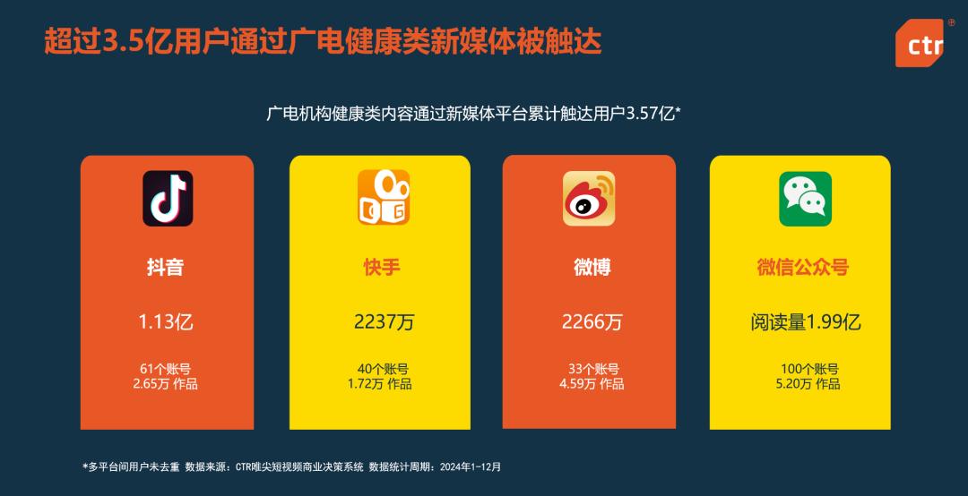 “国家队”CTR唯尖短片商业决策系统显示:2024年,CTR唯尖短片商业决策系统,广播电视健康新媒体帐号共发布超级14万阅读量和赞10W以上的作品 近期爆款作品 800篇 ,通过新媒体平台,健康类内容累计触达用户3.57亿,数百万及以上的帐户正在蓬勃发展。