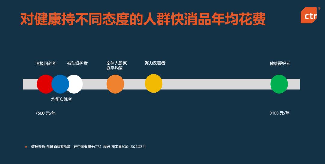 有些群体有困扰,还要强大。付费意愿祝福。根据凯度消费者指数的调查,健康爱好者在快速消费品中的年平均消费量最高,达到每年9100元。保持健康的生活方式真的需要更多的钱。健康行业的目标客户通常瞄准中高消费者。他们消费能力更强,愿意为健康产品支付溢价。