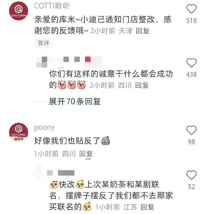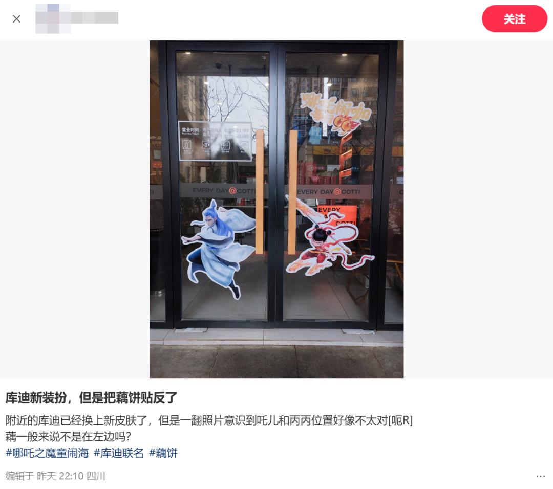 有网友随意提到哪吒和敖丙在某店的海报上下贴反,被大数据推给店员,店员立即表示快速调整。即使只有CP粉丝关心这个细节,库迪也主要推广“听劝告”。