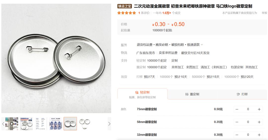 以15.9元的酒吧套餐为例。1688相关工厂价格,75毫米反光白酒吧单价1.5元左右,生产量超过1000元,批量生产成本可降至1元以下。亚克力冰箱贴和金属徽章的价格比较高,但也和酒吧差不多。生产量越大,价格越小。