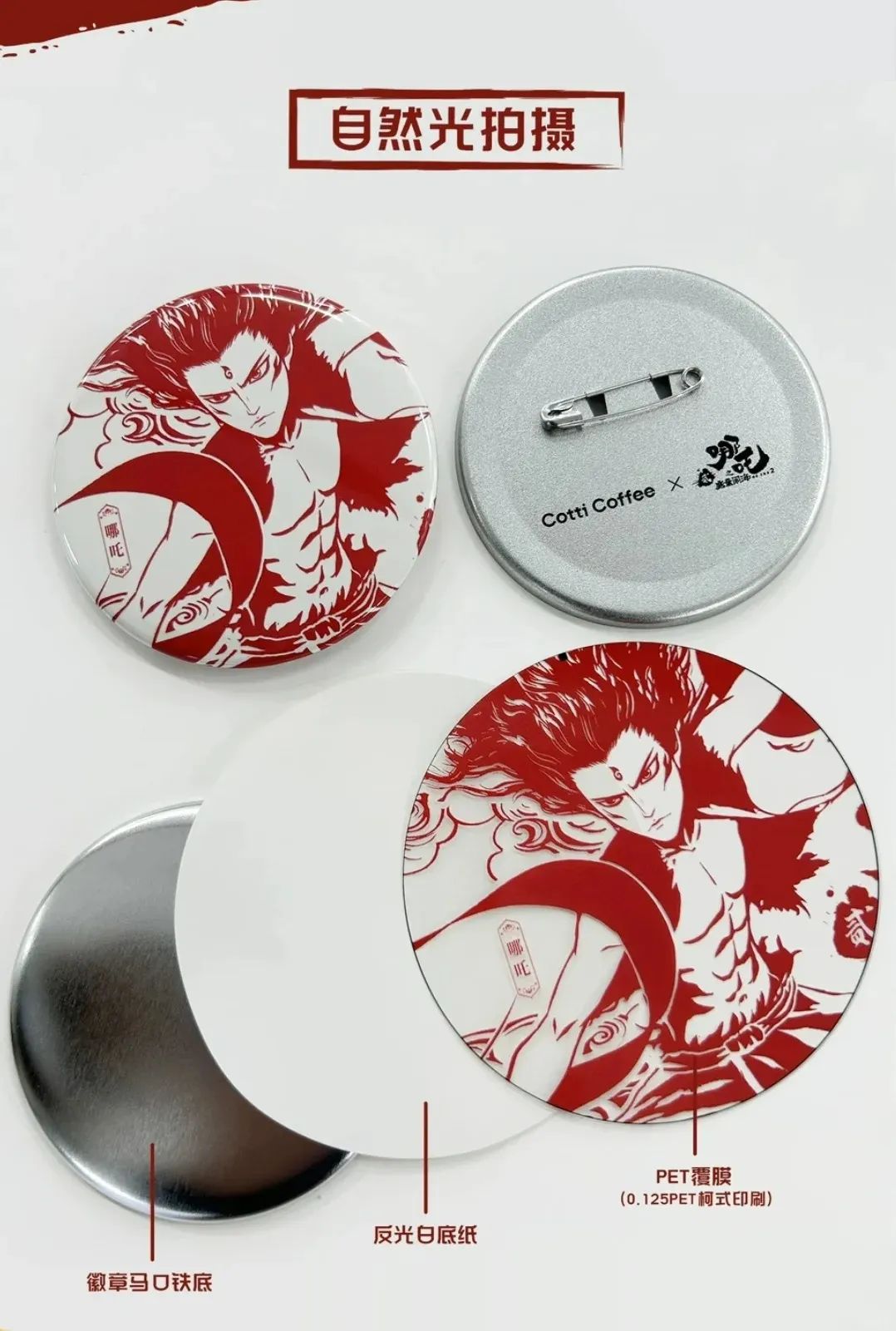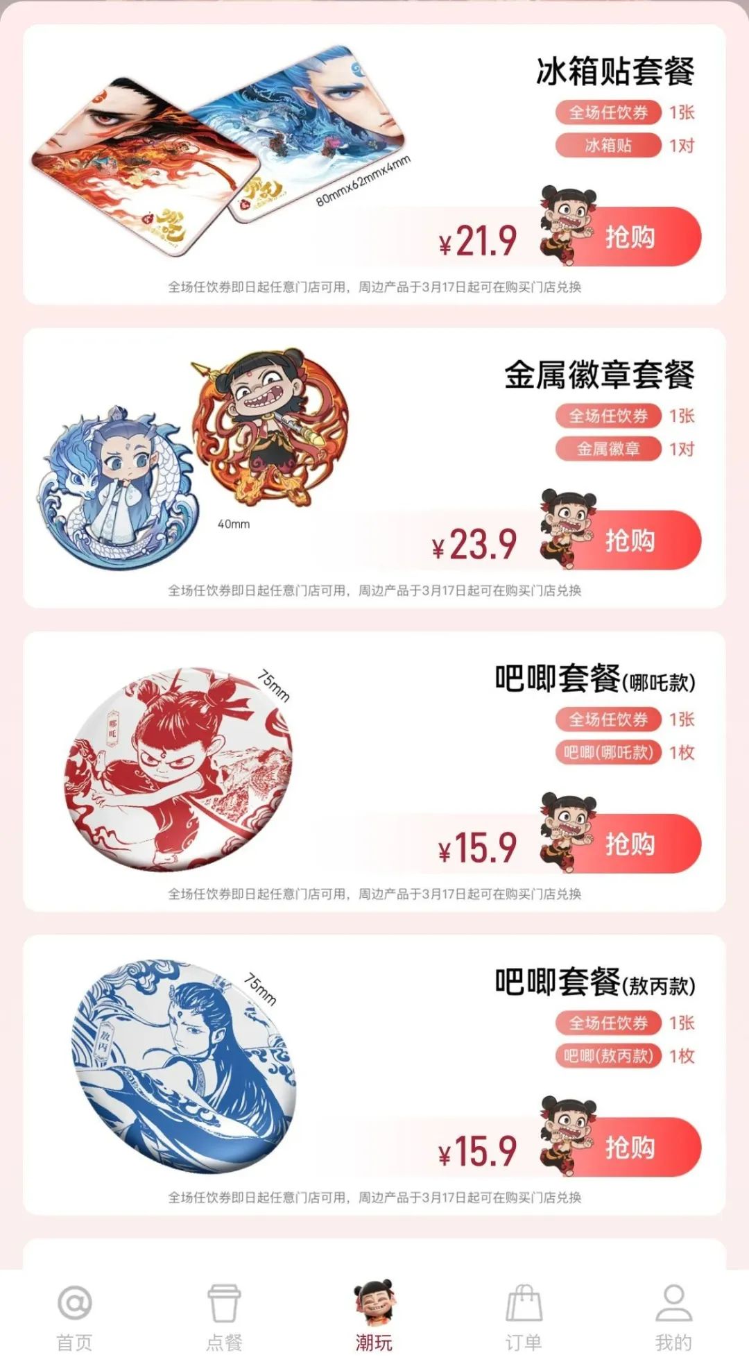 所有套餐的咖啡券只包含一杯可选咖啡,三个月内就可以核销。周边选择时,给消费者充分的选择空间。哪吒、敖丙的冰箱贴纸共21.9元;两枚浮雕镂空勋章,共计23.9元;75毫米马口铁吧唧唧,六款自选一款,15.9元。