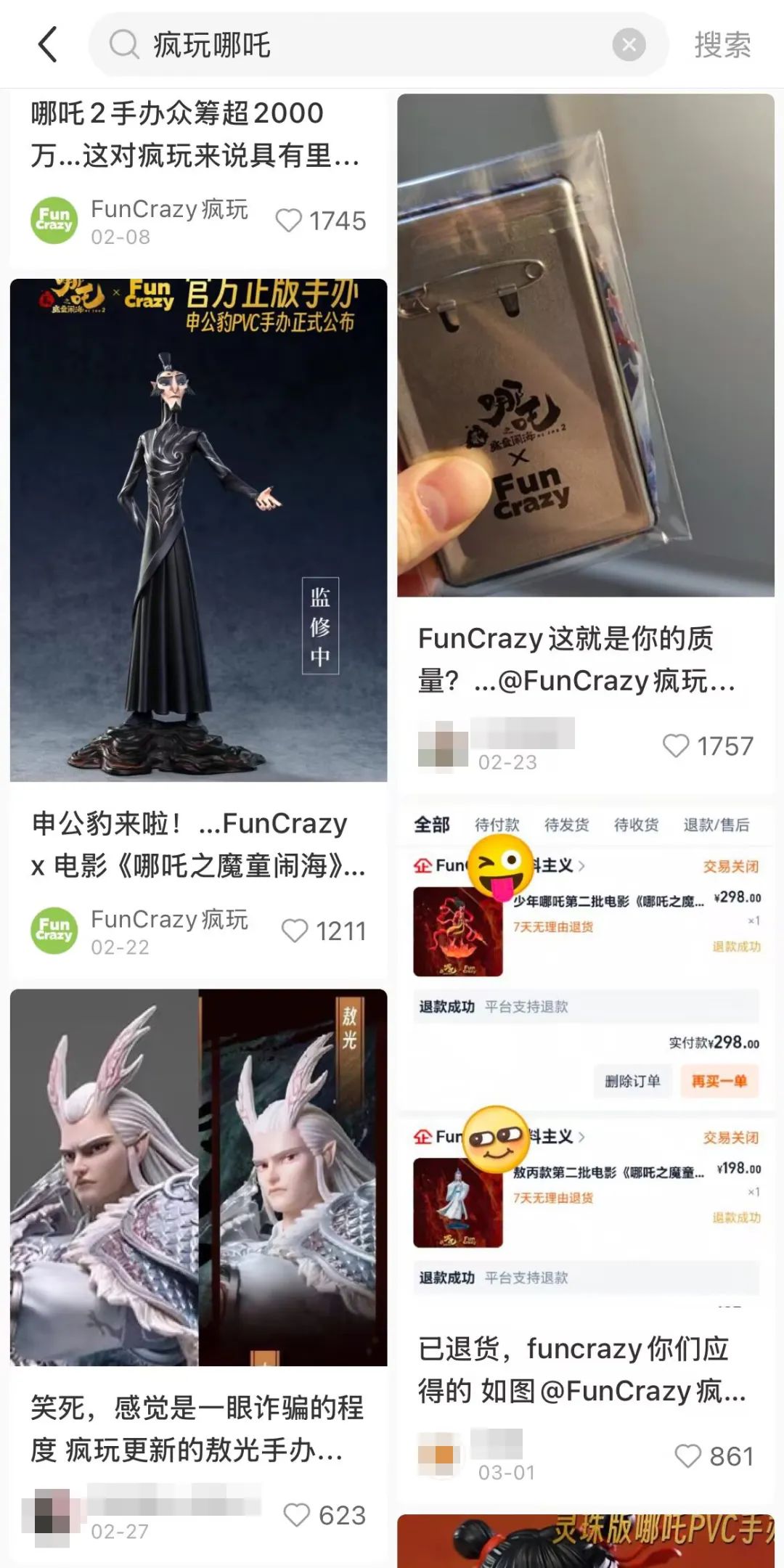 与上一代相比,《哪吒2》的衍生授权更加外置,“FunCrazy塑料主义”是各品牌知道要把握观众消费热情最高的阶段之一。这个曾经的小众模玩品牌,首次进行了大规模的衍生开发,其周边众筹成绩非常可观。但现在在社交媒体上搜索相关讨论,手工制作的物品被贴上了“防雷”的标签。单领75mm白瓷底吧唧定价20元,有人吐槽“不如5元自印”。甚至店铺售后、客服态度等问题也被消费者的负面情绪占据。