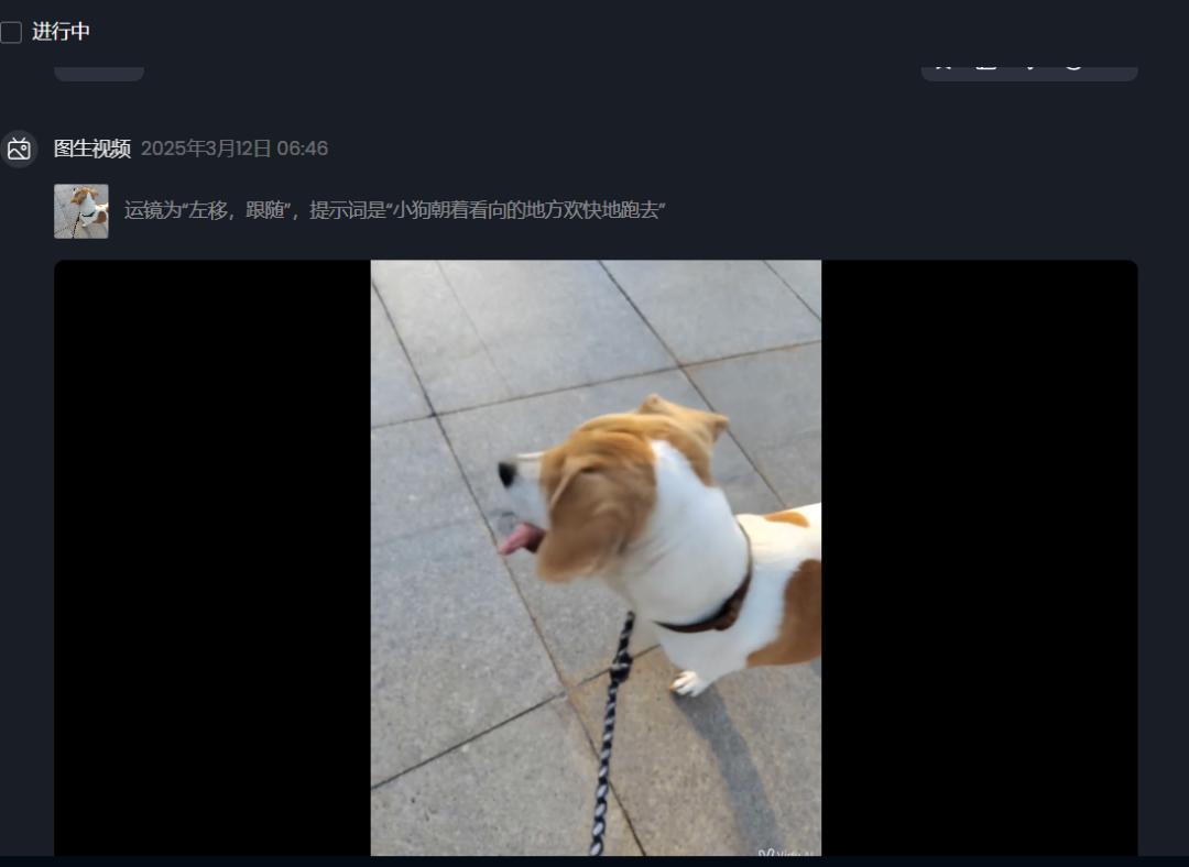 小狗图片的感觉似乎有点“失败”。视频显示了“左移”的提醒,但几乎没有显示跟随这个动作,小狗也没有跑。在这方面,海螺AI生产的视频更加丰富真实。然而,Vidu在一些细节处理方面是一个亮点,例如小狗吐舌头、耳朵晃动等处理整体令人满意。