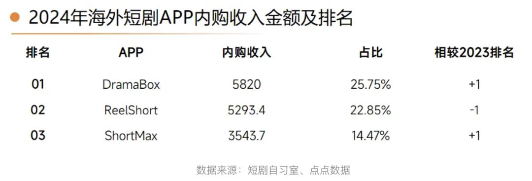 点点数据显示,DramaBox在2024年海外短剧APP内部购买收入方面已经与ReelShort相当,均超过5000万美元。ShortMax排名第三,规模小于前两者,内部购买收入约3500万美元。