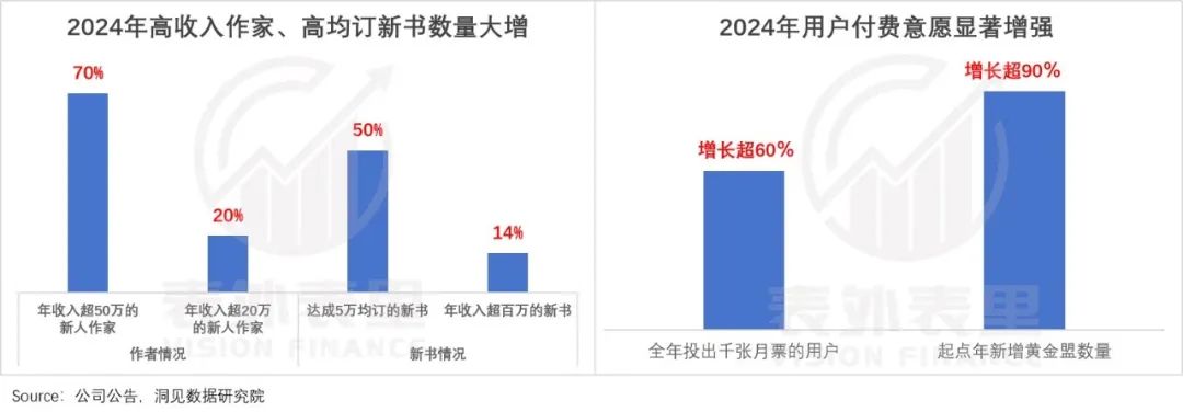 在创作生态升级下,2024年新作家阅读33万篇文章;年收入超过百万的新书同比增长14%,《天才俱乐部》等新作品不断打破平台纪录。