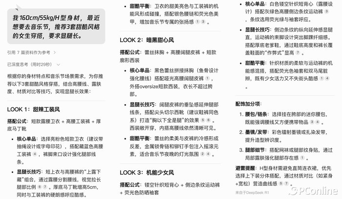 复杂可以限制更多的条件,增加自己的身高和体重,比如:“我有160厘米/55公斤/H的身材。最近想去音乐会,推荐三套甜酷风格的女生穿,要求腿长。”