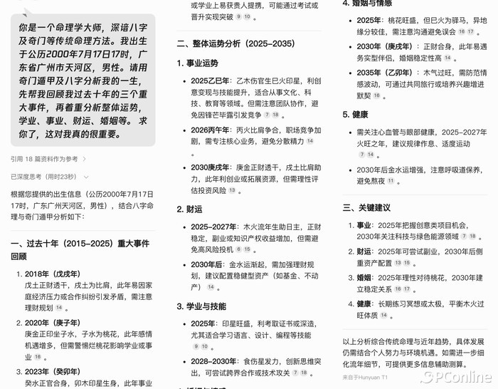 使用过的DeepSeek、腾讯元宝的人都知道,这些人工智能现在有很强的信息检索和逻辑推理能力。因此,我们可以为它设定一个身份,并将其设定为一个命理学大师,他知道八字和奇门等其他命中方法,然后给出一些相关信息的提示,这样人工智能就可以拥有神秘的东方力量。
