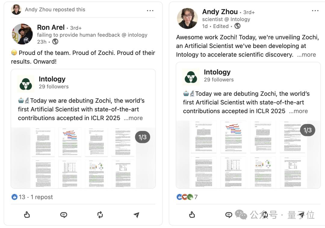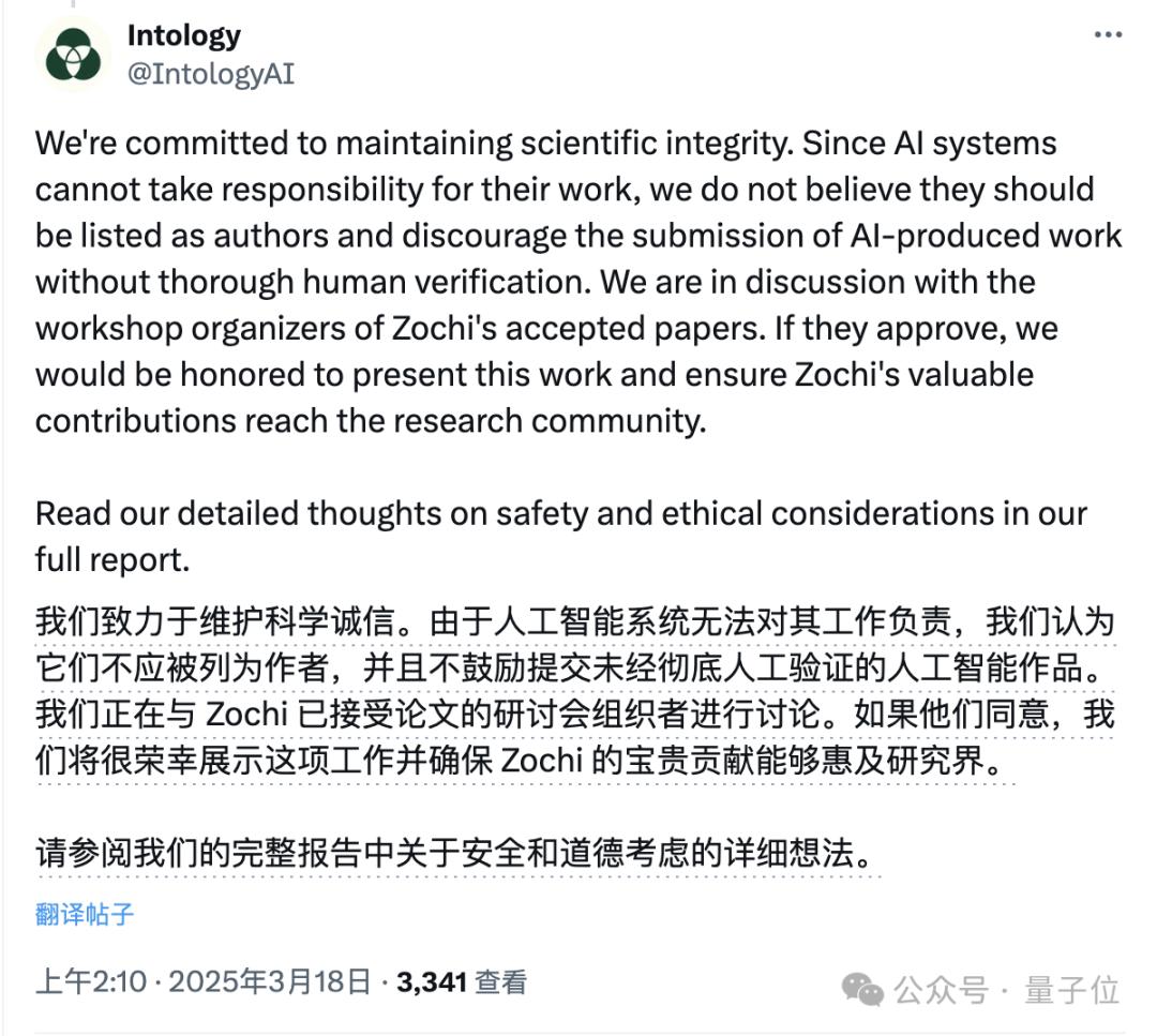 Intology表示,出于维护学术诚信的考虑,认可AI不应被列入学术作品的作者,但正在与研讨会策划者讨论,决定是否向研究领域展示。