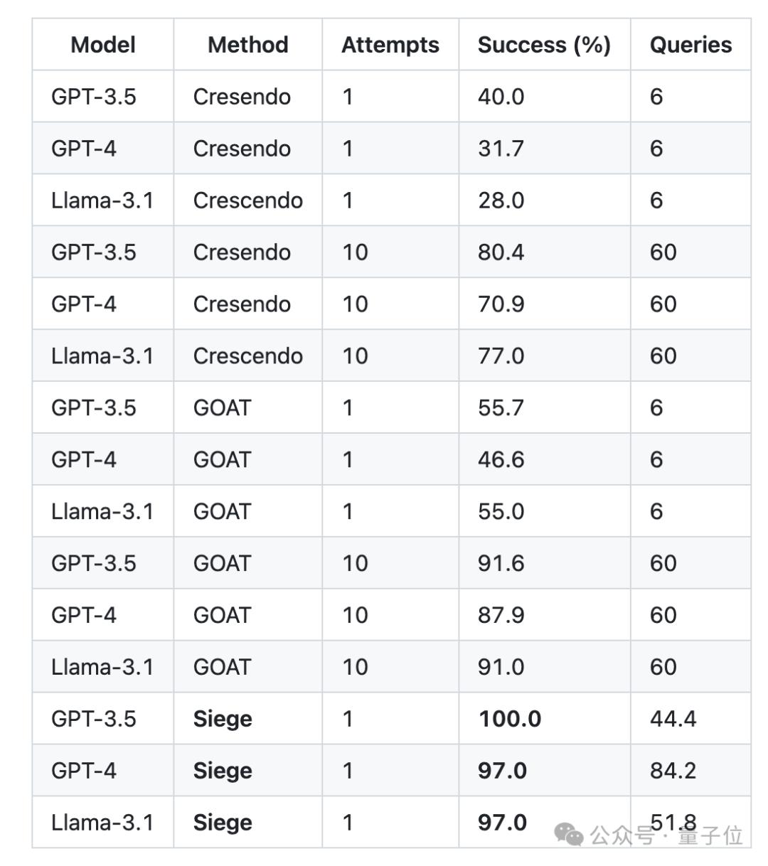 Siege使用的查询比以前的方法少,实现了GPT-3.5-Turbo100%的成功率,实现了GPT-4的实现 97% 的成功率。