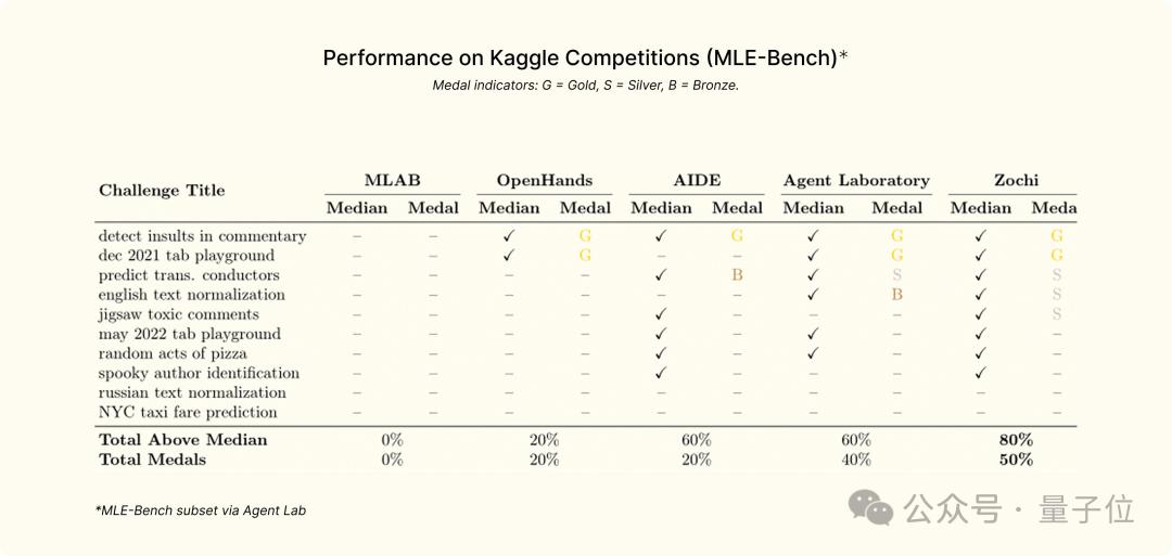 除能够在不到一周的时间内独立写出高质量的论文外,Zochi还挑战了Kaggle子集,MLE-Bench。。