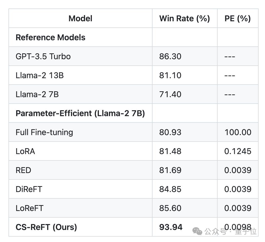 在Llama-2-7B中使用时,CS-在AlpacaEval上,ReFT获得了93.94%的胜率,GPT-3.5不到万分之一的参数。-Turbo(86.30%)。