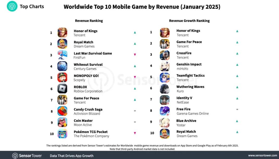 这直接推动了《王者荣耀》的日常生活和氪金。Sensor Tower 数据显示,2025 年 1 《王者荣耀》月收入接近月份 42 从个月到现在,最高值,强势回归 1 月球手游畅销榜冠军宝座宝座 。