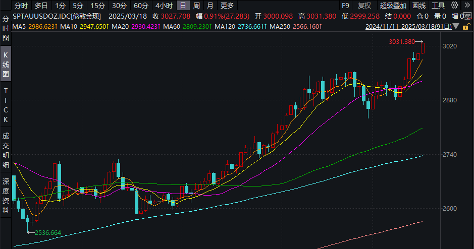 继纽约黄金期货市场超过每盎司3000美元后,伦敦现货黄金于3月17日收于每盎司3000.83美元,创历史新高。北京时间18日晚,国际黄金价格再创新高。Wind数据显示,伦敦现货黄金价格一度超过每盎司3030美元,涨幅接近1%。