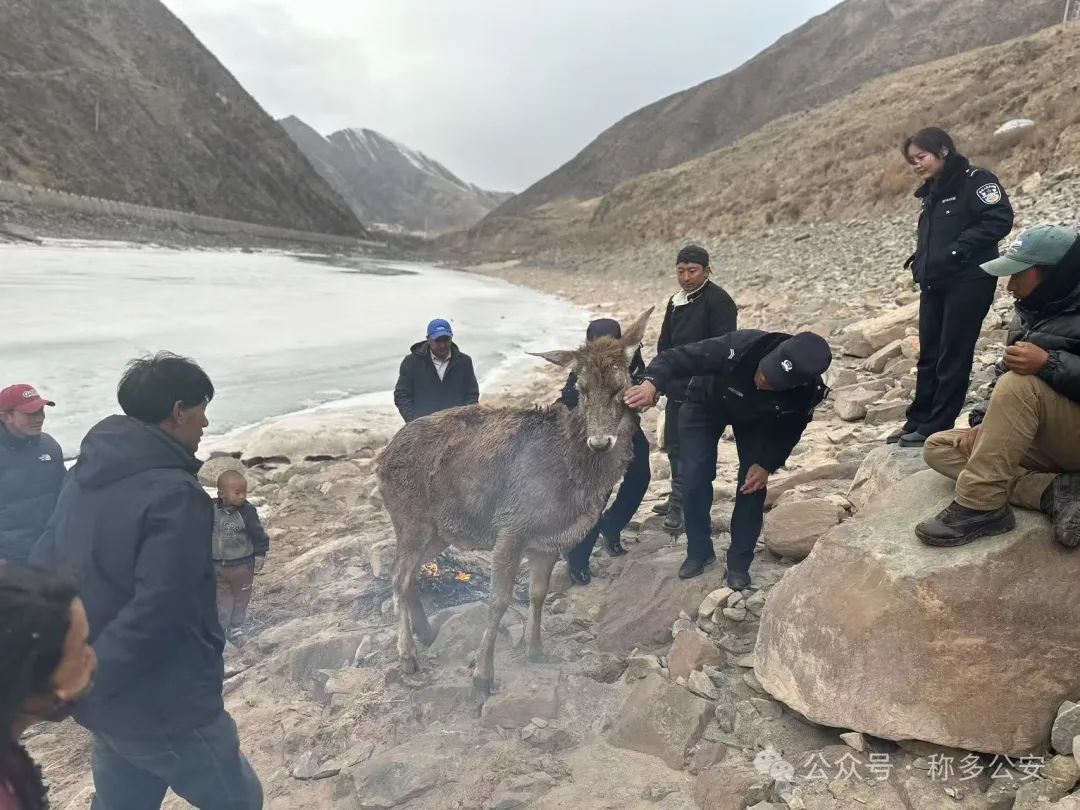 到达现场后,发现白唇鹿被困在通天河冰窟,由于长期挣扎,体力消耗严重,精神萎靡。随后,民辅警与拉布乡派出所、现场护林员和群众进行了联合救援。经过两个多小时的努力,被困的白唇鹿成功上岸。经检查,白唇鹿长期被困在冰窟,体力消耗严重,行动能力差,民辅警为其生火取暖。体力恢复后,白唇鹿会自然释放。