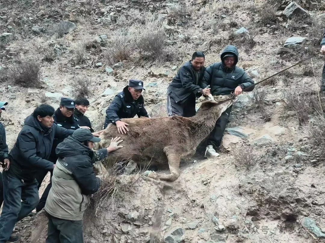 三月十七日,森警大队接到群众报警,称拉布乡有白唇鹿被困在天河中,要求报警。