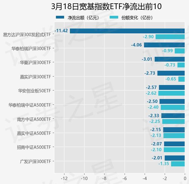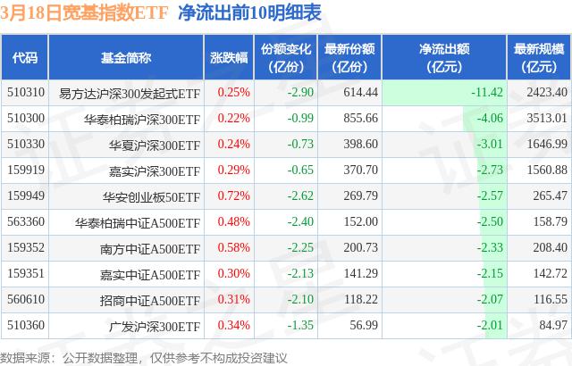当天有 150 只宽基指数 ETF 资金净流出出现在基金中,其中E基金净流出排名第一。 300 发起式 ETF(510310),份额下降 2.9 一亿份,净流出额为 11.42 亿元。